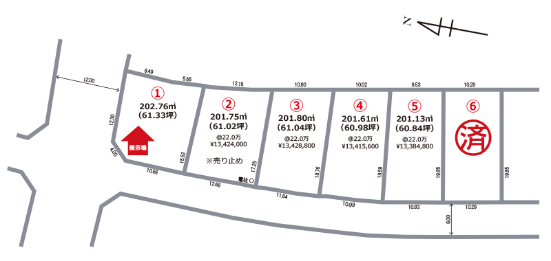 | 土地面積 | ②201.75㎡(61.02坪) ③201.80㎡(61.04坪) ④201.61㎡(60.98坪) ⑤201.13㎡(60.84坪) |