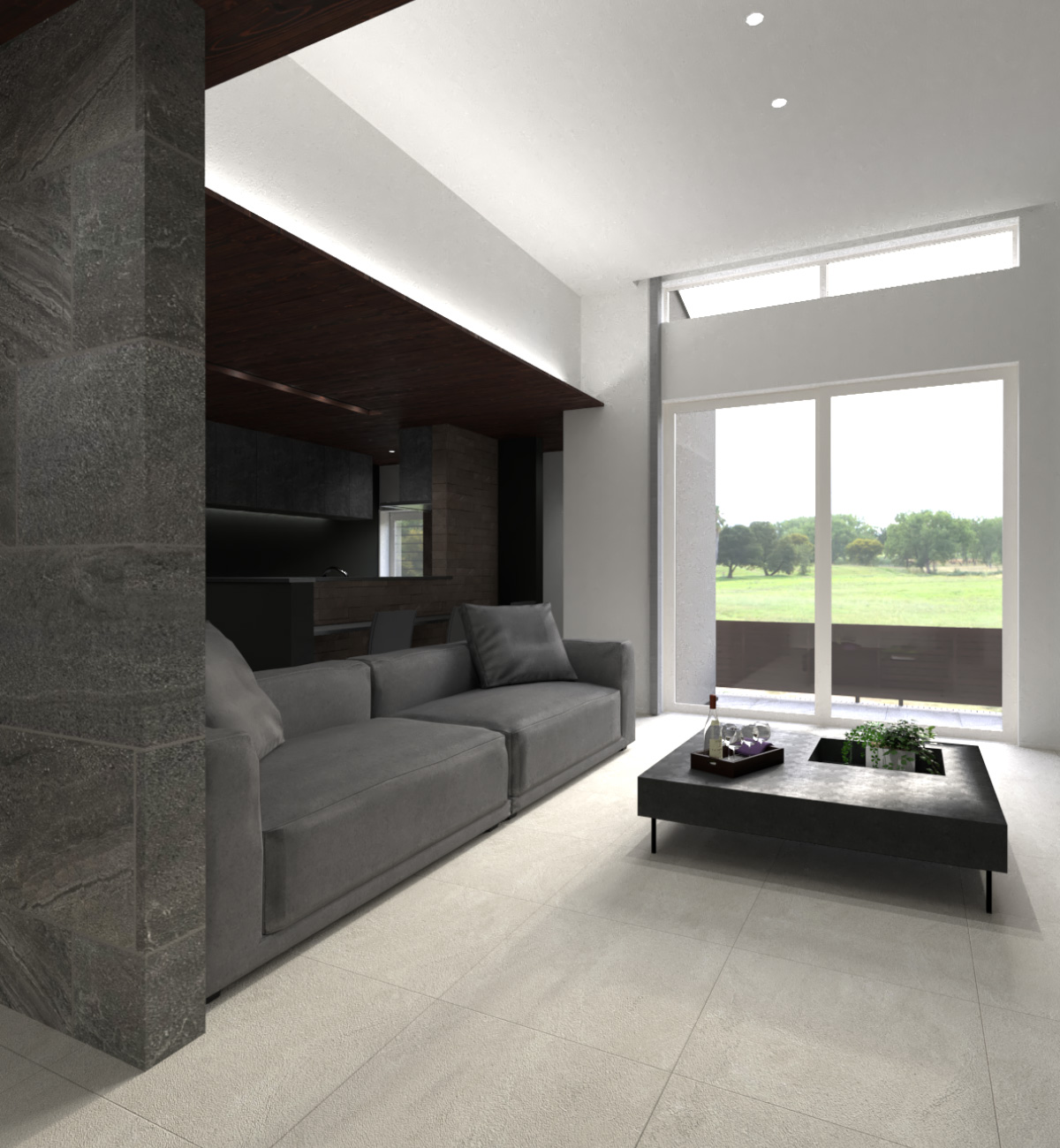 リビング高天井を実現するスキップフロアの大空間勾配天井アトリエ。