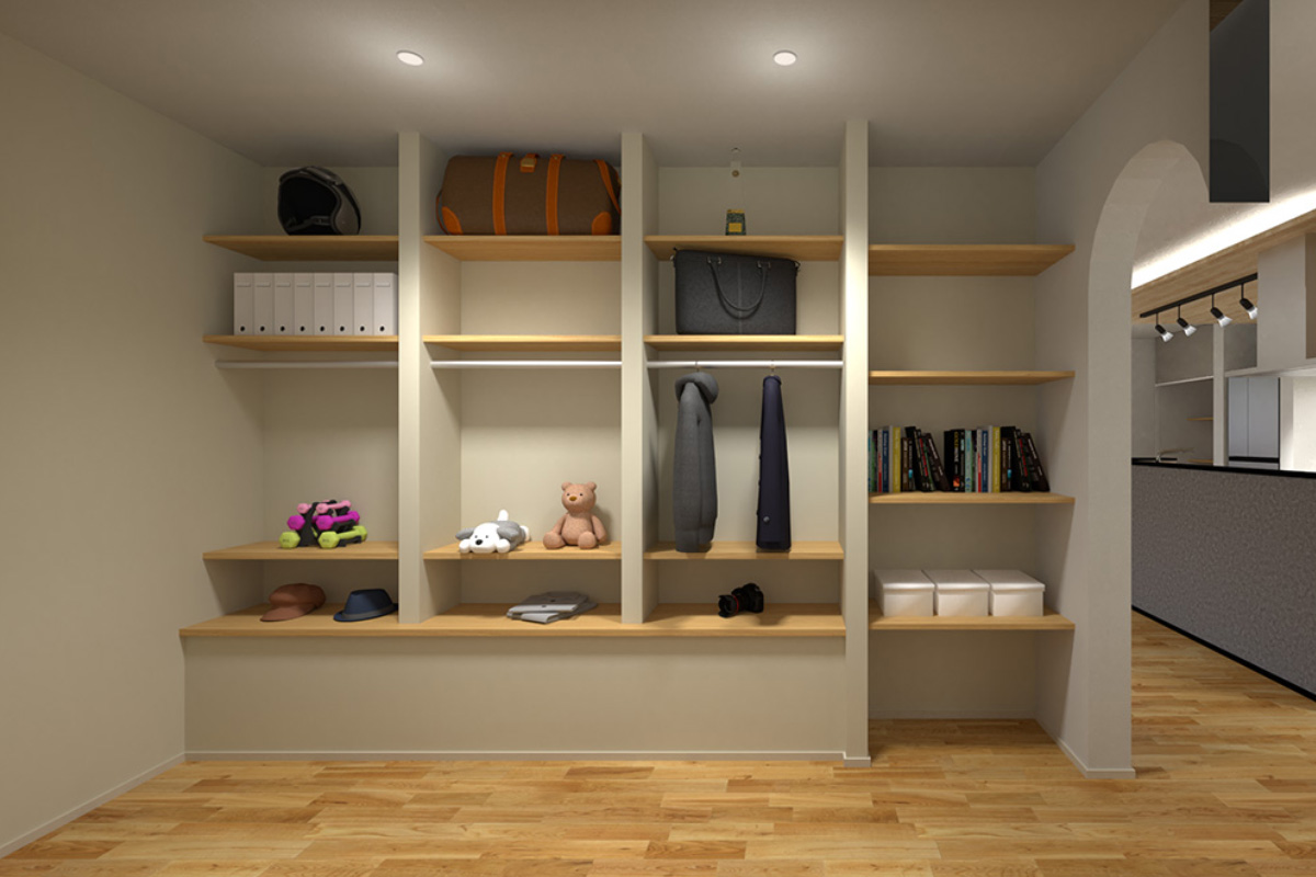 玄関横に設けたこだわりのロッカールームは帰ってきたらまず自分たちの荷物の片付けを済ませてそのままリビングへ、子育て世帯が絶対真似をしたくなる間取りになっています。